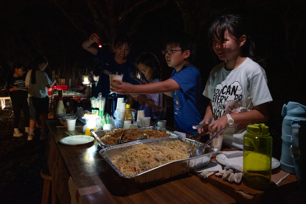 日中は、屋台準備に取り組むか、プールや登山など遊びに行くか、それぞれのグループで選択と調整が行われました。祭りの開始が近づくと、火起こしや食材の下ごしらえなど野外調理が進み、本番では大きな呼び込みの声とともに活気ある雰囲気に包まれました。
