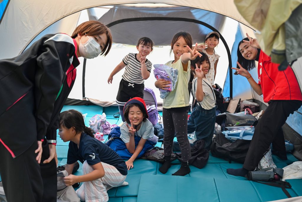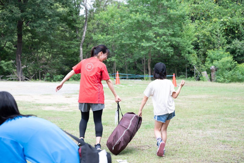 昼食後は、宿泊に使用するテントを各グループで設営しました。初めての作業に苦戦するグループもあれば、経験を活かして自信を持って取り組むグループもあり、それぞれ工夫しながらキャンプ場に次々とテントを立てていきました。