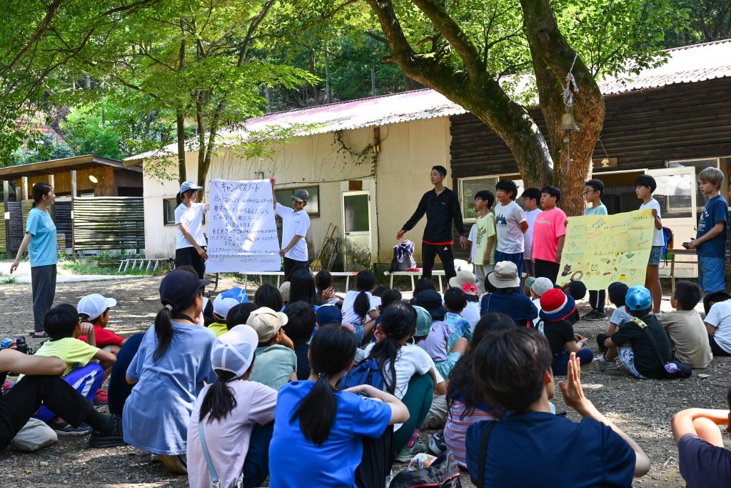 昼食後、バスでの出発前にフォレスターズキャンプと地球人キャンプの参加者全員が集まり、お別れ会を行いました。リーダーからのメッセージに続き、地球人キャンプのメンバーからフォレスターズキャンプの仲間へ、キャンプソング「キャンパスノート」が歌のプレゼントとして贈られました。その歌詞に繰り返し登場する「また会える日まで」というフレーズが何度も出てきました。来年も再びこの場所で集い、ともに過ごせることを願う時間となりました。