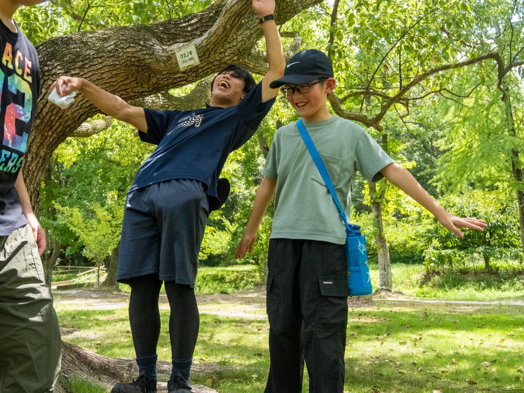 【穴あき川柳ミッション】では、森の中の看板を見つけてワードを埋めていきます。「リーダーここにあったよ」「木の下に発見」など協力して探していきます。