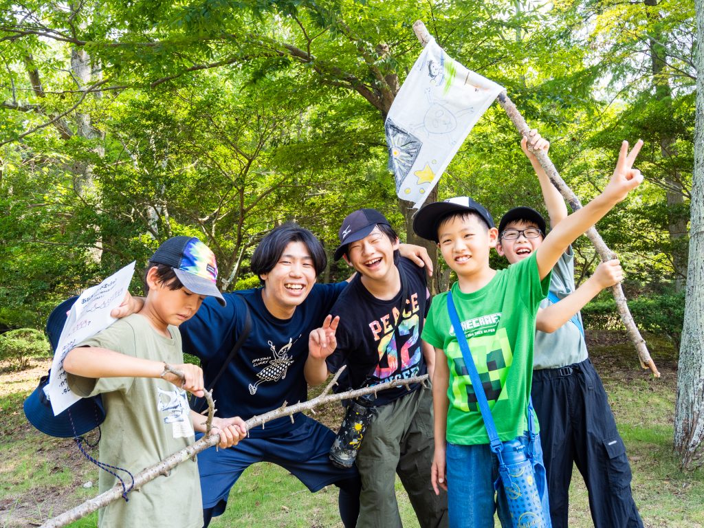 【旗づくりミッション】では、グループオリジナルの旗を作っていきます。「リーダー、この枝に旗をくっつけよう」とそれぞれ工夫しながら作りました。