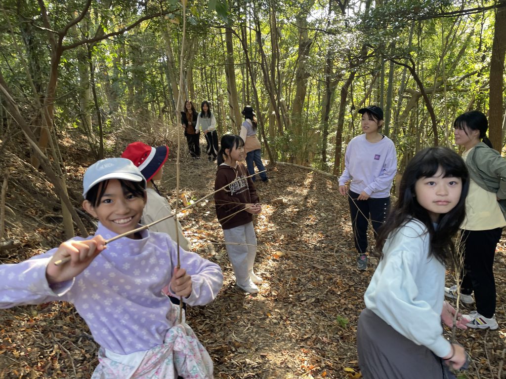 昼食後は、約3時間のグループタイムです。グループの友だちと相談し、思い思いの時間を過ごしました。森の中でカフェを開いて他のグループをお客さんとして招いたり、体育館下で栗を探したり、本格的な基地作りを楽しみました。