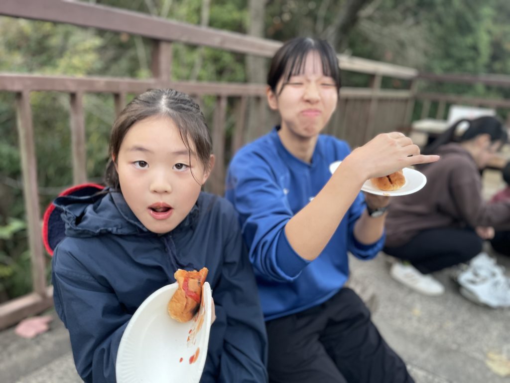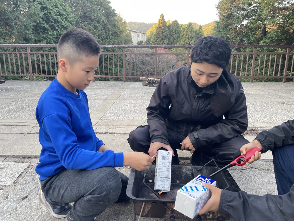 夕方には、軽食として「カートンドッグ」を作って食べました。パンにウインナーや野菜を挟み、牛乳パックに入れて焼くという手軽な方法でしたが、子どもたちからは「簡単にできて、おいしくてサイコー!」「美味しくできてうれしかった」と大好評でした。