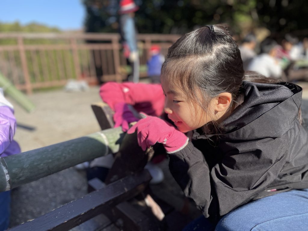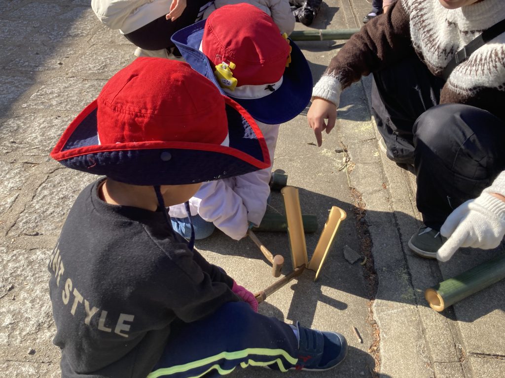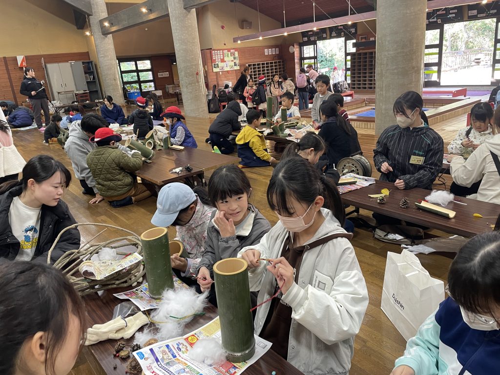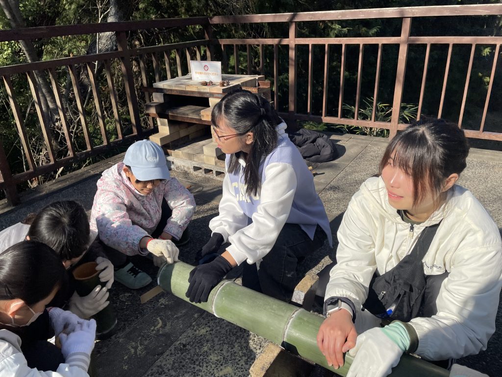 到着後は、「クリスマスアート」作りがスタート。竹を器にして、オリジナルの飾りを作りました。「うまく竹が切れないや」「ここ、ちょっと持ってて!」と、慣れないのこぎりに苦戦しながらも、自分たちの好きな大きさに切り出していきました。