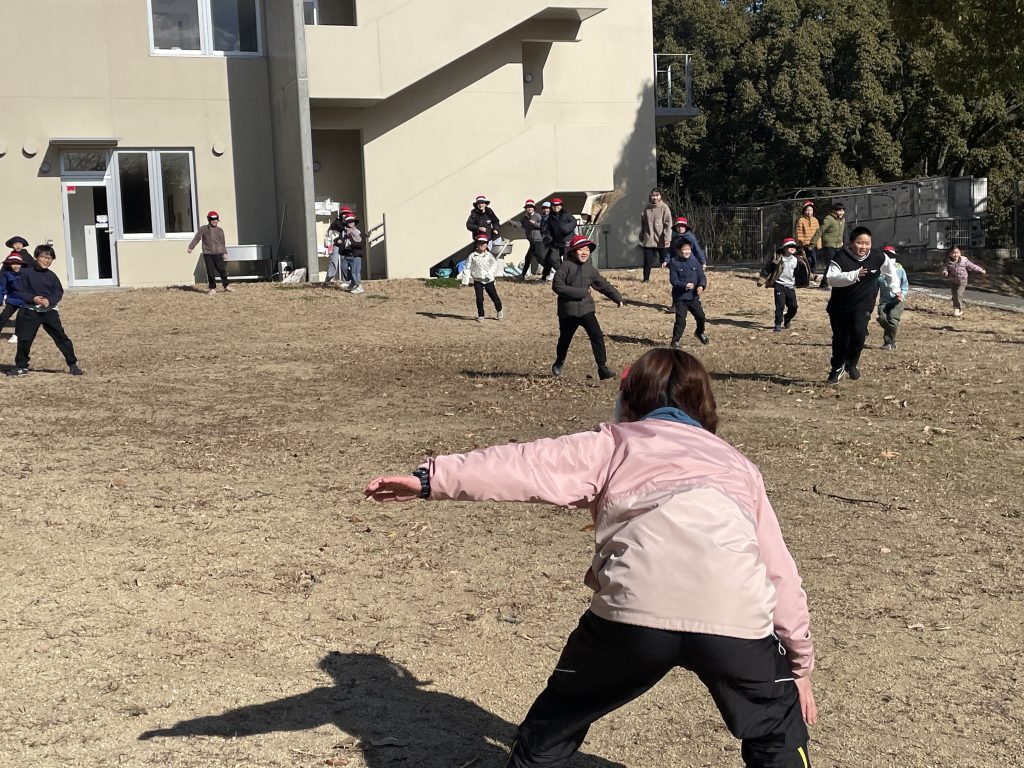 到着後は、節分にちなんで「ケイドロ」を行いました。鬼のお面をつけたリーダーたちが登場すると、子どもたちは大はしゃぎ!「こっちだよ〜!」「もっと本気で追いかけて!」と声をかけながら、芝生広場を縦横無尽に逃げ回ります。捕まった仲間をみんなで助け出し、結果は子どもチームの圧勝。寒さを忘れて走り回りました。