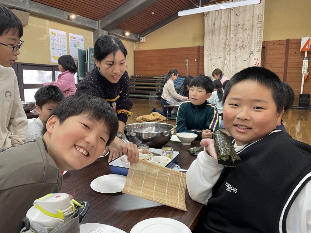 お昼はいよいよメインイベントの恵方巻作りです。「食べたことはあるけど、作るのは初めて」という子が大半で、まさに初体験の連続でした。 酢飯をうちわであおいで冷まし、海苔の上に好きな具材をのせて、丁寧に巻いていきます。「見て、うまくできた!」「めっちゃ太くなった〜」と、予想以上にみんな器用に巻き上げ、立派な恵方巻が完成しました。