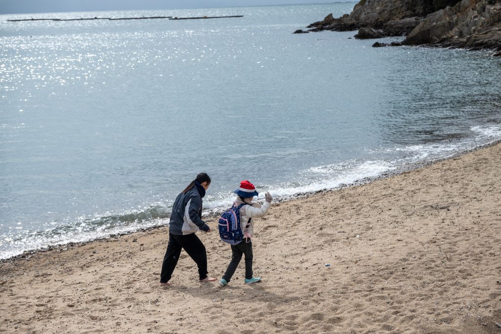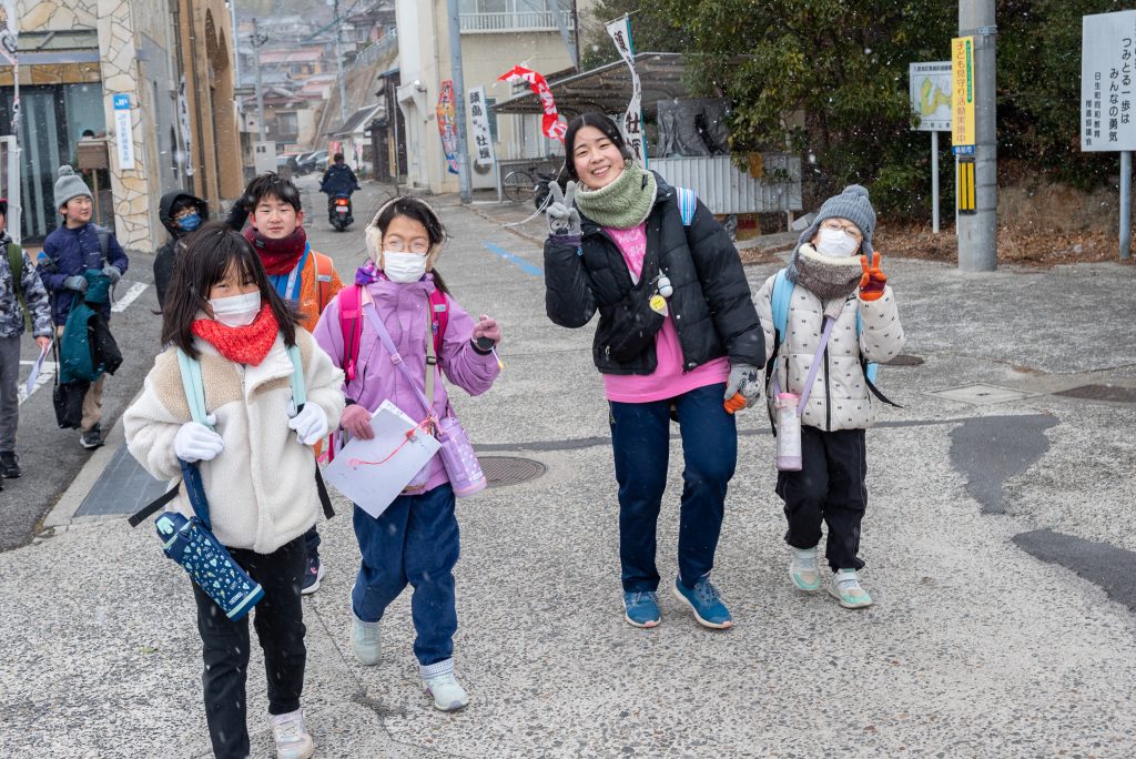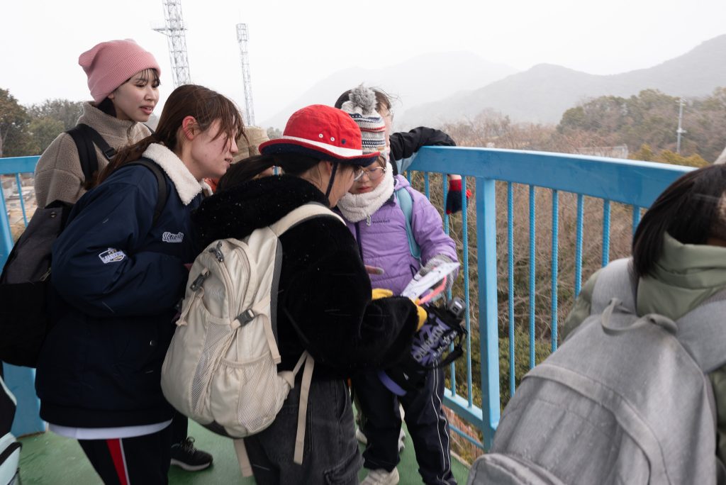 2月の野外活動は、バスに乗って備前市日生にある頭島へ行ってきました。今回はグループに分かれて「島探検」を実施。島内10か所に設置されたクイズを、地図を頼りに探しながら島を歩きました。周囲約4キロの小さな島ですが、実際に歩いてみると登り坂も多く、クイズを探しながら進むのはなかなか大変そうでした。地図を囲んで「次はこの道に行ってみよう」「ここはどの辺りかな?」と話し合いながら進むこどもたちの姿が、とても印象的でした。島の中には、島全体を見渡せる展望台や、海水浴ができるきれいな砂浜もあり、クイズの合間にはグループごとに遊ぶ姿も見られました。