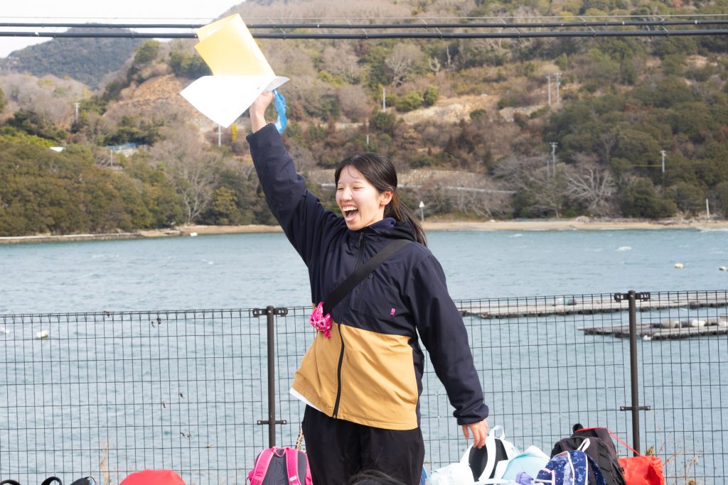 1日思いきり島を歩き回ったあとは、バスの待つ場所へ戻り、みんなでクイズの答え合わせを行いました。正解が発表されるたびに「よっしゃー!」とグループ全員で喜ぶ姿もあり、1日の出来事を振り返りながら、楽しい時間を過ごしました。