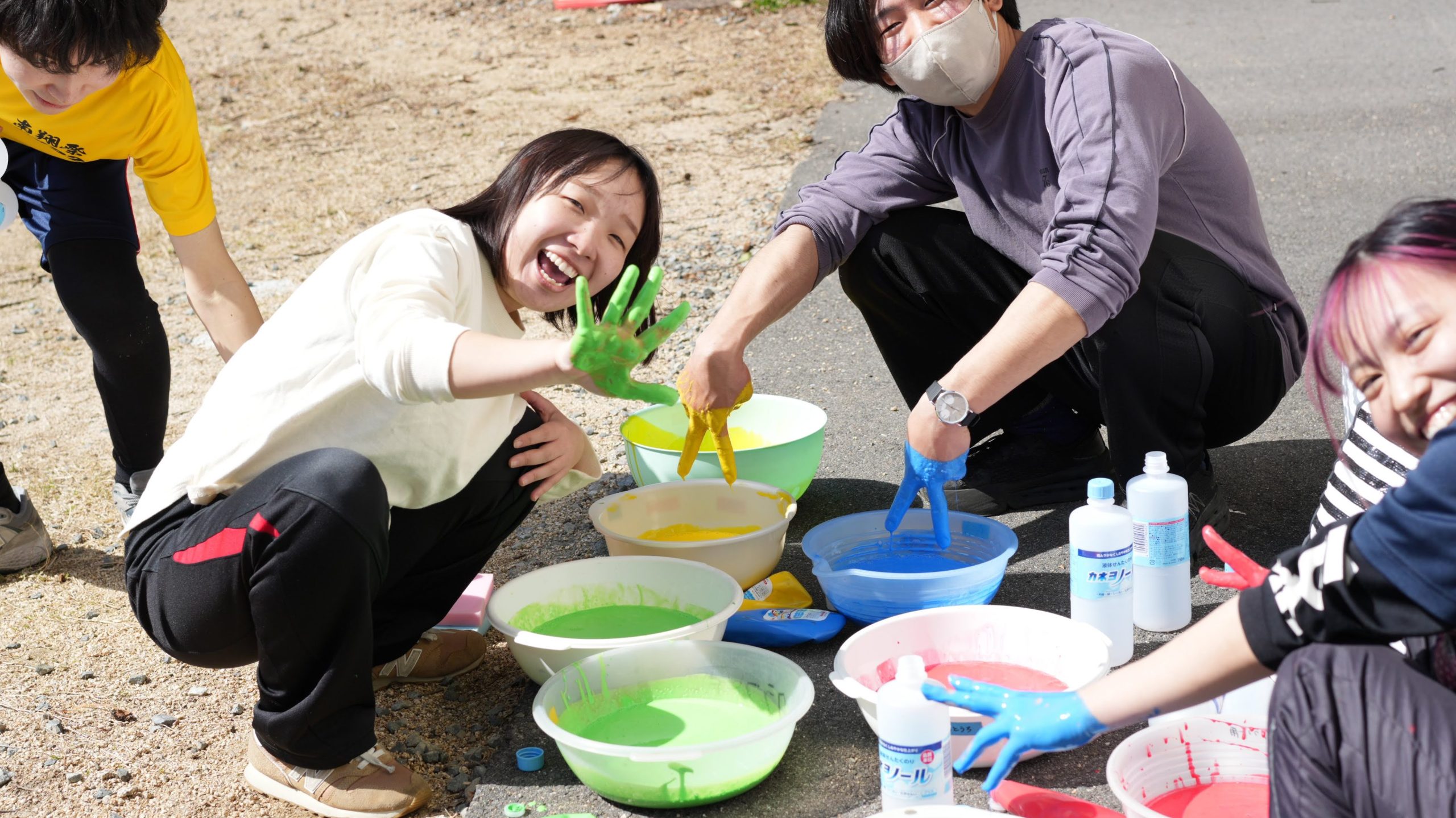 午後はみんなサンダル姿になり、大きな白い紙のまわりに集合。チームごとにインクを分け、スプラトゥーンのような色ぬり合戦が始まりました。いつもはなかなかできない、なんでもありの色ぬりゲーム。手や足を使って思いきり色を広げながら、こどもたちは夢中になって遊んでいました。気がつけば紙よりも髪のほうが色づいているリーダーもいて、何がなんだかわからないけれど、とにかく楽しい時間が広がっていました。
