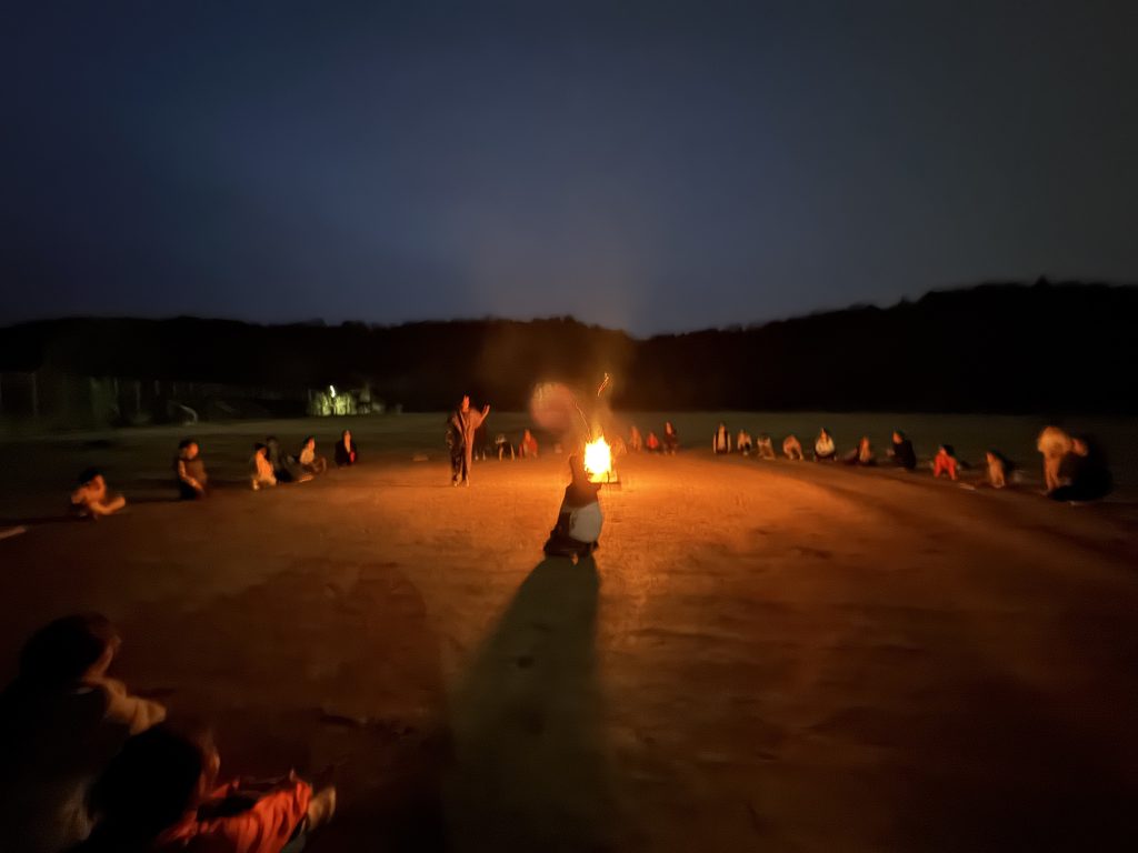 夜の闇に浮かび上がる「レインボーキャンプファイヤー」。見たこともない虹色の炎に包まれる特別な夜。